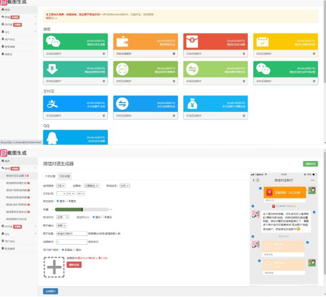 在线一键制作各种截图生成,包含生成功能:微信对话、微信领取红包、微信付款详情、微信收款详情、微信转账详情、微信零钱页面详情、微信扫码付款账单、微信对话和红包带安卓设置、微信朋友圈转发详情、支付宝聊天详情、支付宝转账详情、支付宝账户余额详情、淘宝订单详情、QQ聊天详情、手机短信聊天详情!